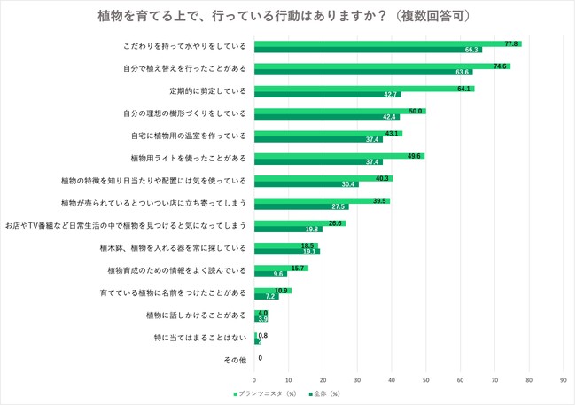 「植物を育てる上で、行っている行動はありますか?」という質問には、全体とプランツニスタともに「こだわりを持って水やりをしている」という回答が最も多く、続いて「自分で植え替えを行ったことがある」「定期的に剪定している」「自分の理想の樹形づくりをしている」の順で回答が多い結果となりました。