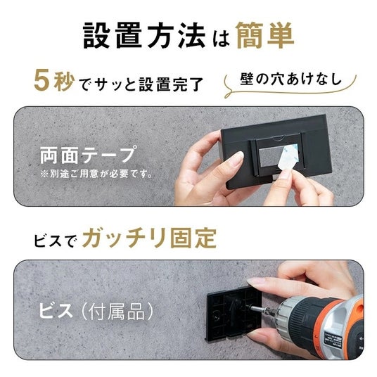 設置方法は2種類。5秒で簡単に設置できる両面テープと、ガッチリ固定できるビス留めがあります。