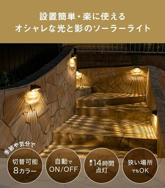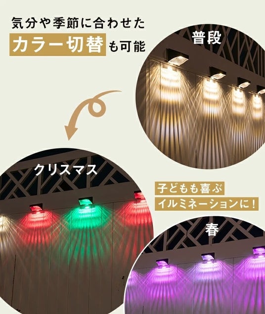 点灯カラー8色・点灯モード3種で気分や季節に合わせたカラー切り替えが可能。クリスマスや春の時期などに合わせて特別なイルミネーションに。