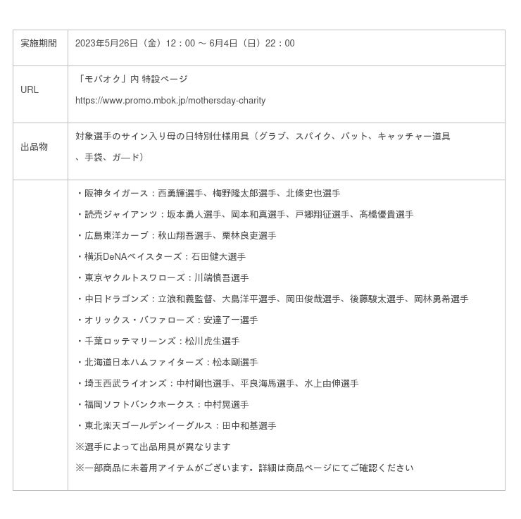 チャリティーオークションでは、SSKアドバイザー契約選手が5月14日(日)実施の「NPBマザーズデー2023」の試合や練習にて、着用し直筆サインを入れたアイテム(※)が出品されます。