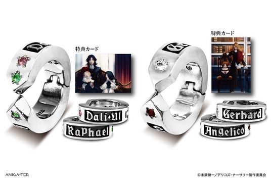 「デリコ家」、「フラ家」をイメージしたフォントで名前を刻み、各キャラクターの誕生石をセッティング。家族写真風の特典カードと一緒にお届けします。