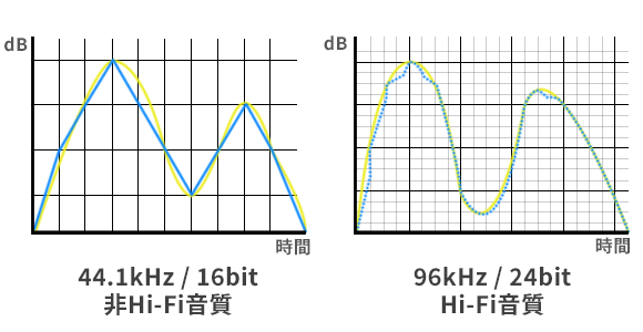 High Fidelity(高忠実度、高再現性)の略語であり、「原音や原画に忠実な再現」という意味を持っています。録音や録画し再生する場合に発生するノイズやひずみを最小限に抑えることができます。