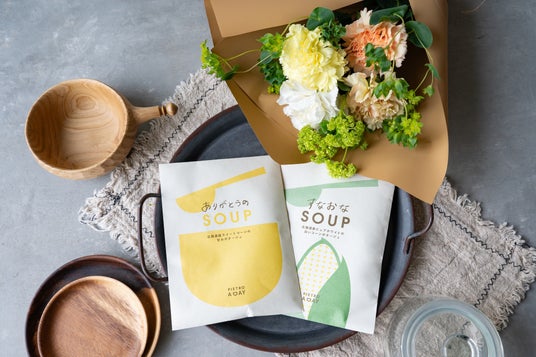PIETRO A DAYのスープにはひとつひとつメッセージが添えられています。本セットの「ありがとうのSOUP」「すなおなSOUP」に日頃の感謝の想いをのせて、スープと同じやさしい色合いのお花と一緒に、お母さんにほっとする時間を贈っていただけたら嬉しいです。
