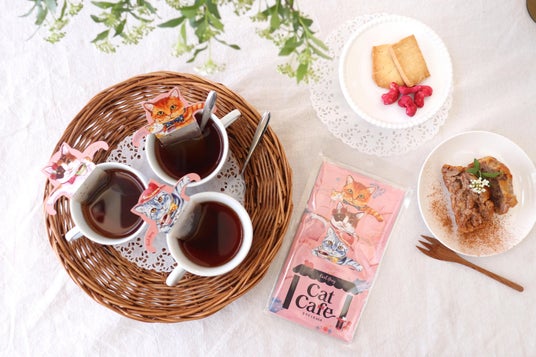 蝶ネクタイをした洗練された猫たちのデザインと、華やかで高級感のあるアールグレイの香りが特徴。一番人気の定番商品として支持されています。また、ハロウィン向けの『ブラックキャットカフェ』やクリスマス向けの『ホワイトキャットカフェ』など、季節限定フレーバーも展開しています。