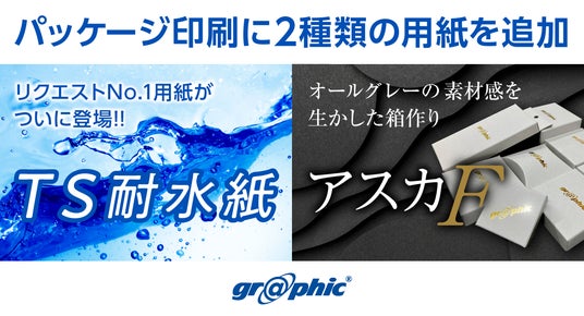 パッケージ印刷に、水回りや冷蔵・冷凍環境で使える「TS耐水紙」と、モダンなグレー色の「アスカF」の対応用紙2種を新たに追加