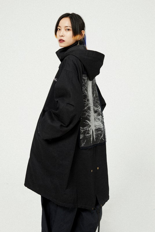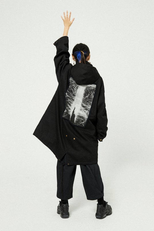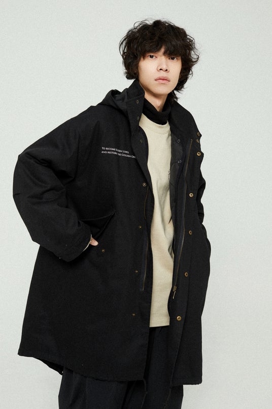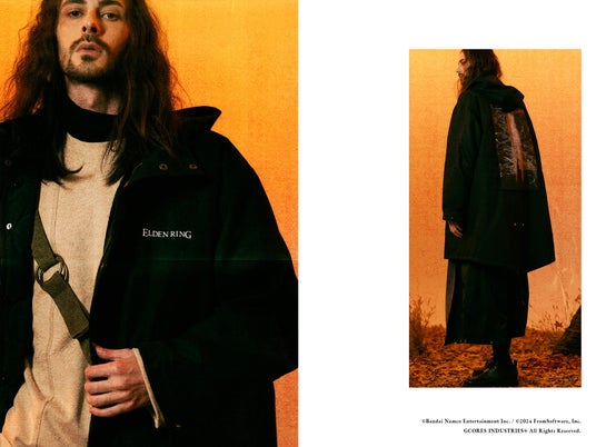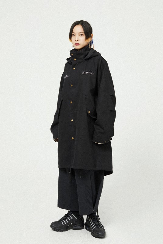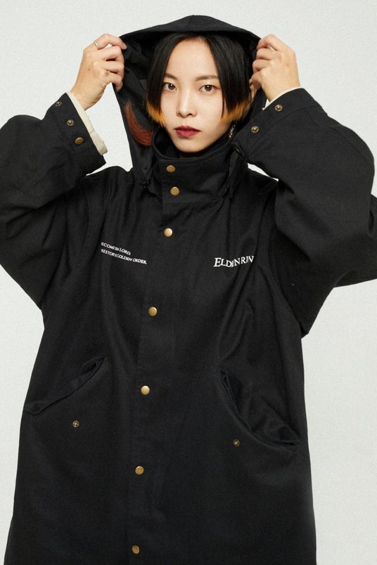 アメリカ軍のM51パーカーのクラシックなスタイルを採用したトレンチコート。内側には取り外し可能な中綿インナーがあり、機能性が充実。フードは自由に取り外すことができます。高密度の純綿斜め織り生地を使用しており、高い保温性を誇ります。背面デザインは、メリナが黄金樹を燃やすシーンからインスパイアされ、彼女のセリフが刻まれています。前胸にはロゴに加えて、指読みの老婆のセリフもプリントされています。