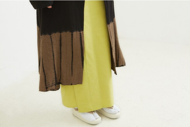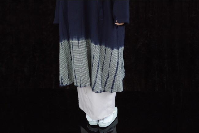 絞りは、愛知県名古屋市・有松にあるsuzusanの工房内で施され、一つひとつ丁寧な手仕事により完成します。『手筋絞り』という絞り方で裾部分を絞っており、絞る(括る)部分が染まらない為、コート地の千鳥格子模様がのぞきます。染色より明るい色のコート地がのぞき、揺れる裾が軽やかな印象です。