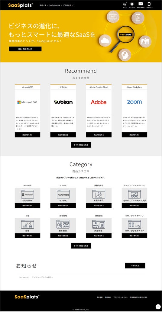 ビープラッツ株式会社(本社:東京都千代田区、代表取締役社長:藤田 健治、以下、ビープラッツ)は、法人向けSaaS(Software as a Service)を一元購入・一元管理できるマーケットプレイス「SaaSplats(R)(サースプラッツ)」の運営を開始したことを発表いたします。