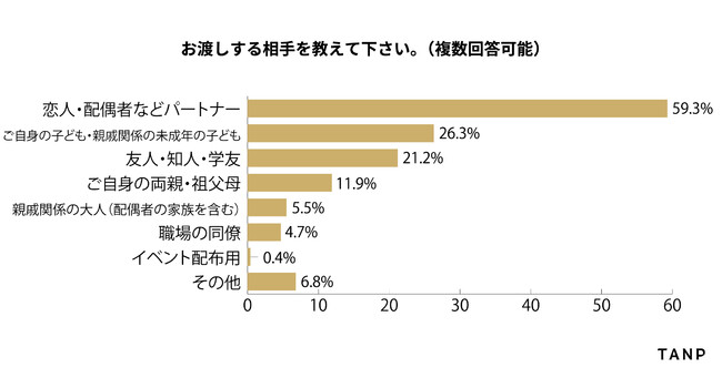 https://prtimes.jp/main/html/rd/p/000000049.000033774.html■プレゼント相手は約6割がパートナー、続いて子どもが多数プレゼントを渡す相手としては約6割が「恋人・配偶者などパートナー」へ、さらに約3割が「自分の子ども」もしくは「親戚関係の未成年の子ども」など、子どもへ贈る結果となりました。クリスマスに贈り物をしたい関係性や、イベントがどのような関係性でより楽しまれているかを感じ取れる結果となりました。