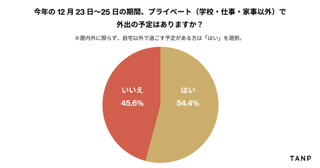 ■2022年クリスマス、約半数が「外出予定」2020年、2021年とコロナ禍が続いていた中、2022年のクリスマスは約半数が「外出の予定がある」と回答。近隣のイベントや飲食店、知人宅で過ごす方に加え、全国旅行支援の対象期間内でもあるため、一部ではその利用者も含まれることが想定されます。