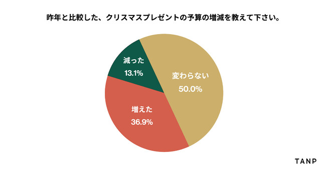 ■予算「変わらない」が半数、増加グループは「あげる人が増えた」、減少グループは「収入減」が多数さらに、プレゼント予算の増減を問う設問では、約半数が「変わらない」と回答。特に「欲しいものの価格帯や、クリスマスにかける予算のイメージが変わらないため」「生活が変わらないため」というコメントが多く寄せられました。