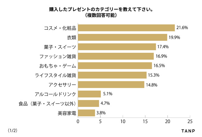 ■王道の「コスメ」「スイーツ」「ファッション雑貨」に加え、「衣類」や「おもちゃ・ゲーム」が人気上記で「購入していない・購入予定はない」を選択した回答者以外に、購入したプレゼントのカテゴリーをヒアリングしたところ、以下の結果となりました。