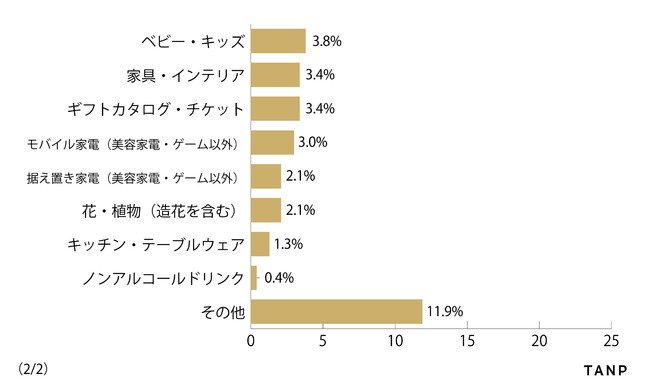 また、「おもちゃ・ゲーム」が多く回答されていることは、次の設問で集計される「お渡しする相手」に「自分の子ども・親戚関係の未成年の子ども」が多く回答されていることと一部相関しており、クリスマスならではの傾向も窺えます。