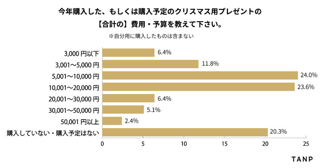 ■回答者の約8割がプレゼントを購入、予算は5千~2万円で半数「今年購入した、もしくは購入予定のクリスマス用プレゼントの【合計の】費用・予算を教えて下さい」という設問では、5,000円~10,000円の範囲が最も多く、さらに上の価格帯である10,001円~20,000円の範囲と合わせて半数を占める結果となりました。また、予算にばらつきはあるものの、回答者(TANP会員)の約8割が「プレゼントを購入した・する予定」という結果にもなり、プレゼントへのモチベーションの高さも窺えました。(後述:昨年比較での予算の増減)