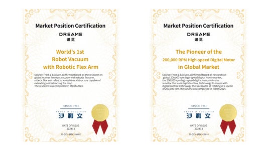 これらの技術的マイルストーンは、国際的に著名な認証機関であるフロスト&サリバン社(Frost&Sullivan)からも認められています。2024年5月のDreame製品発表会において、中国地域のパートナーであるYang Xiaochen氏は、Dreameに「世界で初めてロボティックフレックスアーム(モップエクステンド(TM)技術)を搭載したロボット掃除機(DreameL20シリーズ)」と「世界初の20万RPM高速デジタルモーター」の2つの認証を授与し、Dreameがスマート家電業界におけるリーディングカンパニーであることを再確認しました。