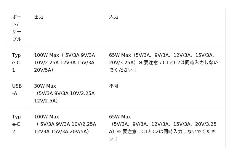 入出力の両方に対応し、最大出力100W・入力65Wという高性能を誇ります。