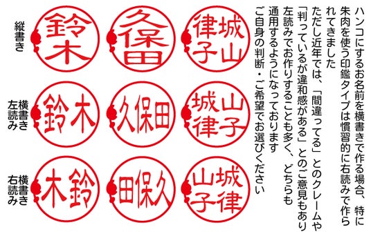 そのためお名前の書き方も一般的な印鑑同様、縦書き・横書き・フルネーム(2行)など柔軟に対応可能です。