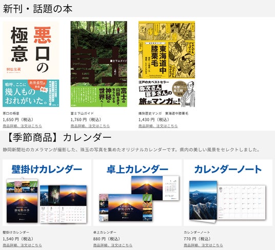 『悪口の極意(著:村松友視)』や『痛快歴史マンガ 東海道中膝栗毛(著:たたらなおき)』などの話題の新刊や、静岡新聞社のカメラマンが撮影した県内の美しい風景をセレクトしたカレンダーを、手軽にウェブサイトで購入することができます。