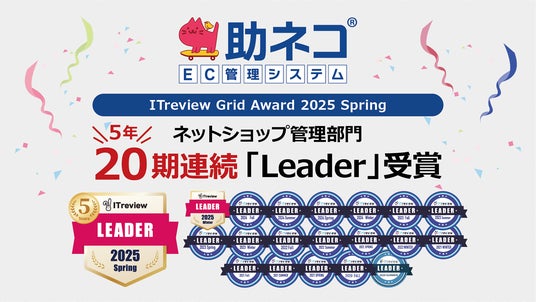 株式会社アクアリーフ(本社:神奈川県平塚市、代表取締役 長谷川 智史)が提供するネットショップ向け業務管理システム「助ネコ(R)EC管理システム(以下、助ネコ)」は、アイティクラウド株式会社(本社:東京都港区、代表取締役社長 黒野 源太)が運営する、ビジネス向けIT製品・クラウドサービスのレビュープラットフォーム「ITreview」において、かねてよりユーザーの高満足度・認知度により、ネットショップ管理部門の「Leader」を受賞してまいりましたが、この度「ITreview Grid Award 2025 Spring」での受賞により、20期連続(通算5年)となりました。