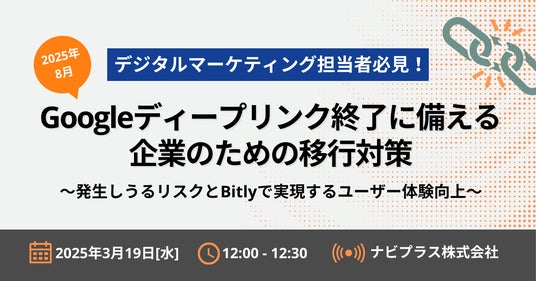 ナビプラス株式会社EC向けマーケティングソリューションを提供するナビプラス株式会社(デジタルガレージグループ会社 / 本社:東京都渋谷区、代表取締役:清水 和徳、以下:ナビプラス)は、2025年3月19日(水)にオンラインセミナー『デジタルマーケティング担当者必見!2025年8月Googleディープリンク終了に備える企業のための移行対策~発生しうるリスクとBitlyで実現するユーザー体験向上~』を開催いたします。