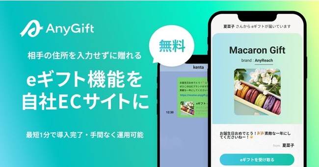『AnyGift(エニーギフト)』は、相手の住所を知らなくてもLINEやメールで贈れる"eギフト機能"を、自社ECサイトにかんたんに導入できるサービスです。