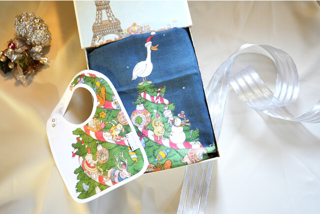 ・SATIN BIB NOEL(サテンビブノエル)Xmasギフトは、ホテルボックスにそれぞれのデザインのおくるみやスタイをセットにしてお選びいただけます。