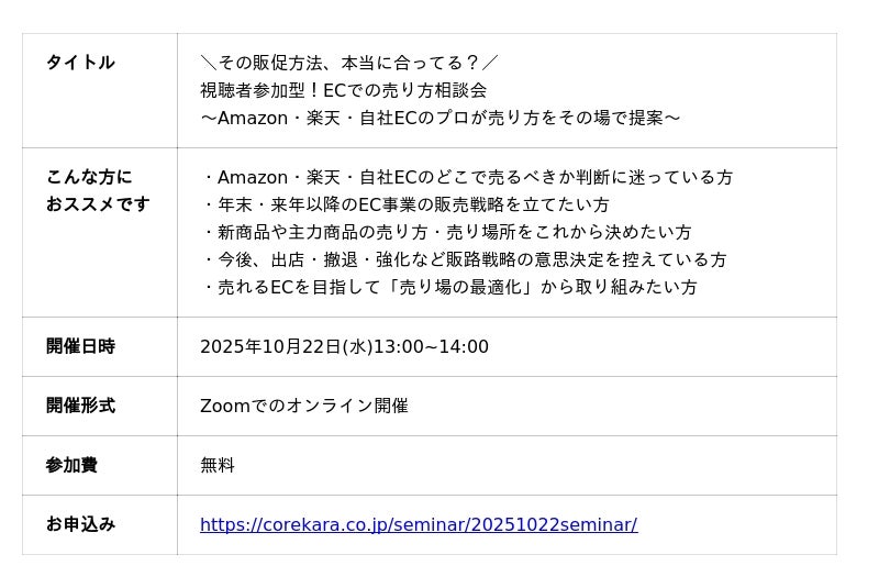 セミナー詳細:https://corekara.co.jp/seminar/20251022seminar/あなたの「売りたい商品」、どう売れば伸びるか一緒に考えます。累計2万件以上のECサイト支援実績を持つ