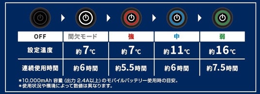 設定温度目安&連続使用時間:上記表の通り