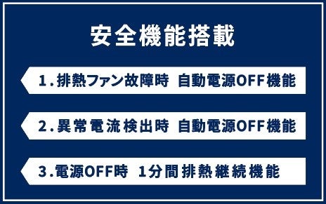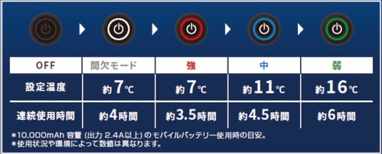 ※1使用時の外気温度とペルチェデバイスとの最大温度差。使用環境によって冷却効果は異なり、身体冷却温度を保証するものではありません。※2【充電式氷嚢ベスト】実際に氷を必要とするものではありません。※3デバイス表面が冷却しはじめるまでの時間。(当社調べ)※4冷感プリントが水分に反応している間。メーカー調べ、涼感性能評価試験。実使用環境では冷感の感じ方に個人差があります。※5.ファンベストとの比較、(当社比)※6. 10分間の冷却と2分間の停止動作を繰り返し、消費電力をおさえます。