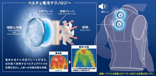 近年では、ファン付きウエアの利用者も増えたことで 暑さ対策ニーズがさらに高まり、「もっと涼しく」 というお客様の声に応えるために、 新たな暑さ対策としてペルチェデバイスを搭載した新商品が開発されました。