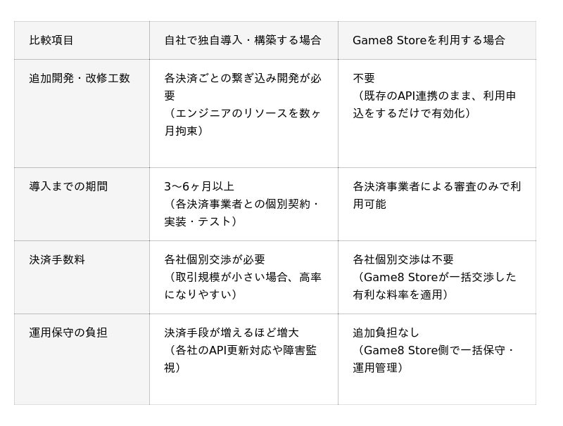 (参考)決済手段を自社で導入する場合との比較パブリッシャー様が同等の決済網を自社で構築・運用する場合、多額の投資と継続的なメンテナンス工数が発生します。「Game8 Store」を活用することで、決済基盤の拡張・運用に伴う負荷を最小化し、より多くのリソースをゲーム本編の開発や自社施策へ振り向けることが可能となります。
