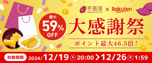 創業からわずか2年で、ネット通販1日1万件以上の注文を記録し、楽天市場で総合ランキング1位を獲得した芋國屋(本社 千葉県流山市)は楽天大感謝祭(12/19 20:00~12/26 1:59)期間中、人気商品を大特価で販売致します!