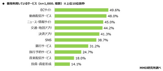 18歳~69歳の男女1,000人を対象に、普段利用しているサービスを聞いたところ(複数回答可)、「ECサイト」が49.6%と最も多く、次いで「動画配信サービス」が48.0%、「ニュース・情報サイト」が45.0%となった。