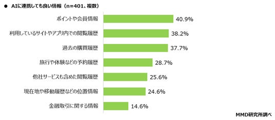 18歳~69歳の男女1,000人のうちAIに連携しても良い情報がある401人を対象に、AIに連携しても良い情報を聞いたところ(複数回答可)、「ポイントや会員情報」が40.9%と最も多く、次いで「利用しているサイトやアプリ内での閲覧履歴」が38.2%、「過去の購買履歴」が37.7%となった。