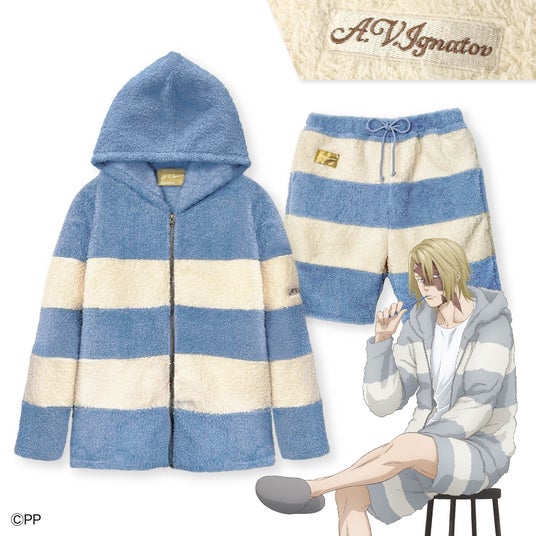 「煇・ワシリー・イグナトフ」が着用しているルームウェアを再現。ブルーグレーとオフホワイトのボーダー生地に、左袖の「A.V.Ignatov」のレッドブラウンの刺繍がポイント。オリジナルネーム付きです。