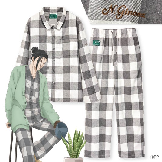 「宜野座伸元」が着用しているルームウェアを再現。モノトーンのブロックチェック生地に、左袖の「N.Ginoza」のブラウンの刺繍がポイント。オリジナルネーム付きです。