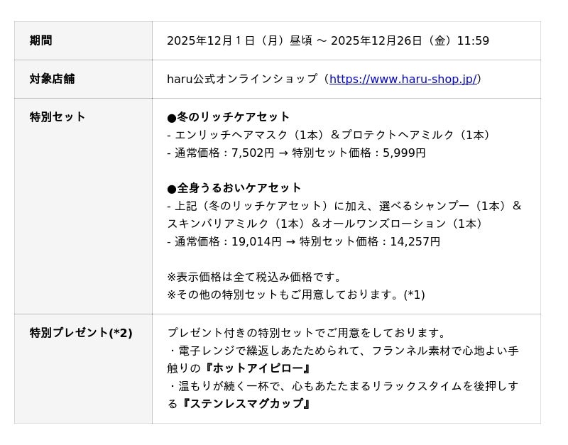 ヘッドビューティブランド『haru』(株式会社nijito/本社:東京都港区、EC事業部:福岡市中央区)は、今年一年の感謝とともにご自身へのご褒美としてはもちろん、大切な方へのギフトとしても最適な特別セットを、12月1日(月)から26日(金)まで限定の「haru Holiday Market」でお届けいたします。