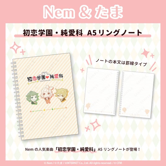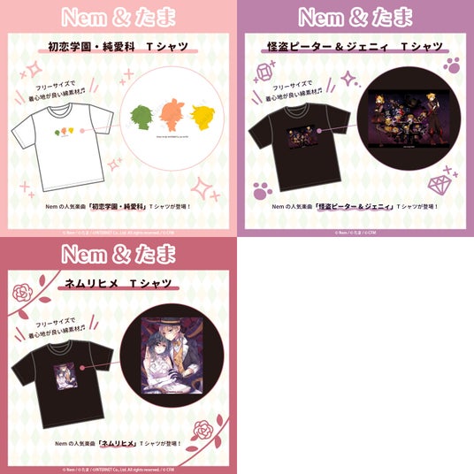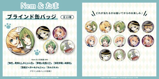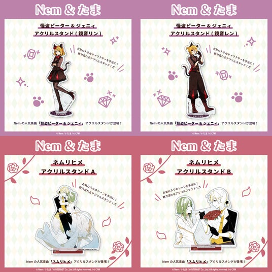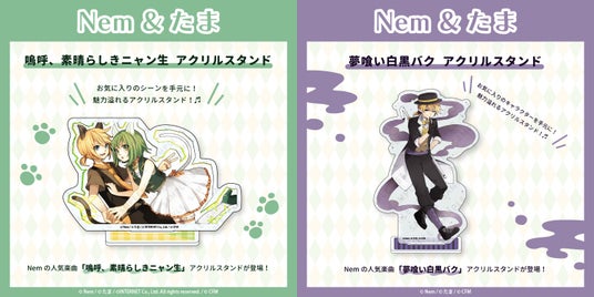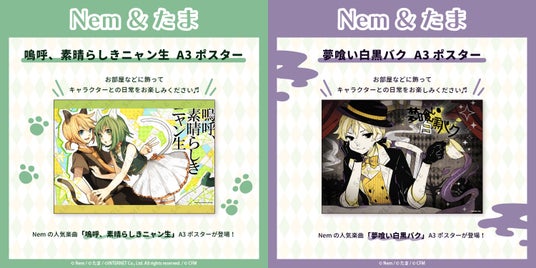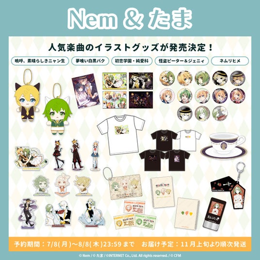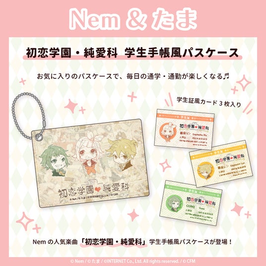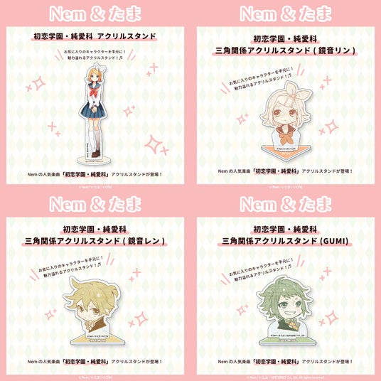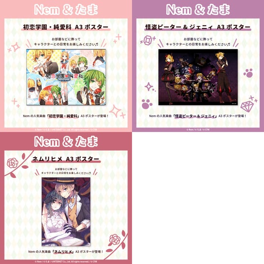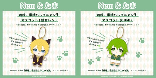 当シリーズは、鏡音リン、鏡音レン、GUMIが歌唱する「嗚呼、素晴らしきニャン生」「初恋学園・純愛科」をはじめとした、キャラクターたちの掛け合いやロマンチックな恋愛ソングなどで活躍されるボカロP・Nemの楽曲をグッズ化したもので、楽曲MVの映像制作を手掛けたイラストレーター・たまのキャラクターイラストを使用しています。※「VOCALOID(ボーカロイド)」および「ボカロ」はヤマハ株式会社の登録商標です