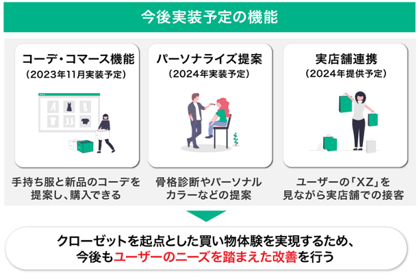 今後は、コーデ・コマースや実店舗対応など多くの機能追加を予定しています。また、クロスブランドやアプリ連携でクローゼットを統合し、最適なファッション体験を提供することで企業として成長してまいります。