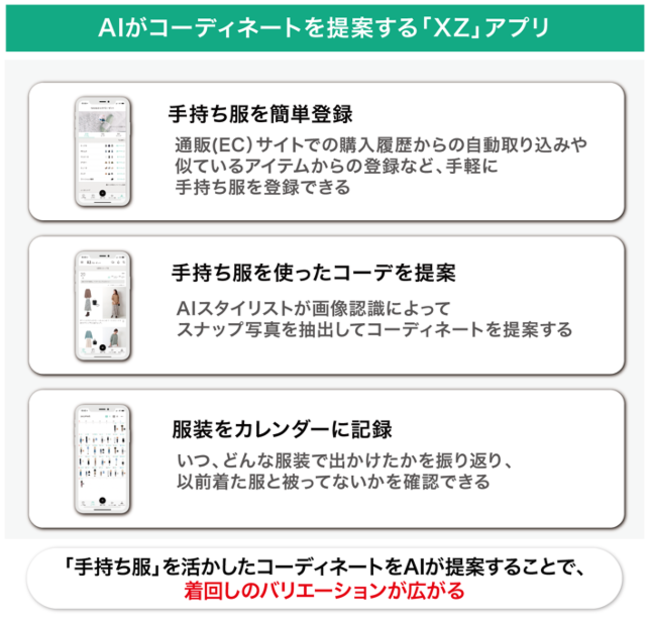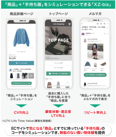 また、「XZ-biz」は「XZ」アプリの仕組み・エンジンを切り出し、アパレル企業のECサイト上で「商品」+「手持ち服」の組み合わせイメージをシミュレーションできるBtoB向けSaaS(Software as a Service:必要な機能を必要な分だけ利用できるソフトウェア)です。これまでのECサイトは商品を単品で陳列するのみでしたが、「XZ-biz」では、そのサイトで服を購入したことがあるユーザーがアクセスすると、サイトで販売している「商品」と購入済みの「手持ち服」を組み合わせて実現できるコーデイメージのシミュレーションを提案したり、相性のチェックなどができます。