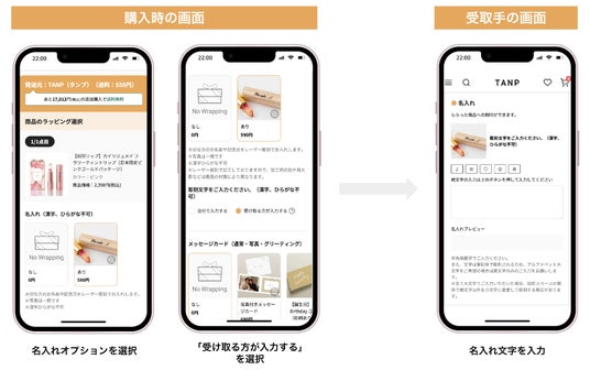 ■名入れを受取手が記入できるeギフト新機能提供の背景TANP(タンプ)では名入れオプションの購入数が昨年から約152%(※1)成長しており、名入れギフトを贈りたいという需要の高さを実感しています。一方で、「出産祝いで贈りたいが、お子さんのお名前がわからない」「友人の結婚祝いに贈りたいが、結婚相手のお名前がわからない」といった際に、ご本人に直接聞くことに抵抗があったり、サプライズのプレゼントができないというご意見をいただいておりました。