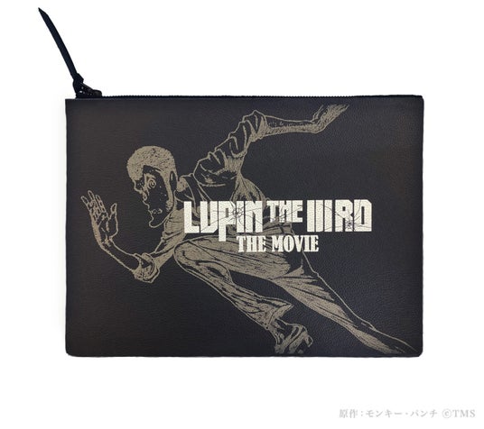 『LUPIN THE IIIRD THE MOVIE 不死身の血族』に使用されるビジュアルをプリントした牛革レザーポーチ。高級スポーツカーに使用されているレザーのアップサイクルコレクション牛革を使用。