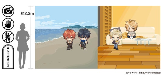 ノイタミナアパレル限定描き起こしデフォルメイラストのフォトスポット。高さ約2.3m、全長約4.5mのパネルにより、キャラクターたちを間近でお楽しみいただけます。