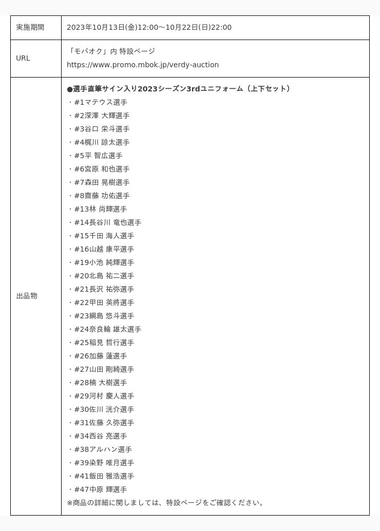 株式会社モバオク株式会社モバオク(本社:東京都渋谷区、代表取締役社長:生田目 知之、以下モバオク)が運営するオークションサービス「モバオク」にて、東京ヴェルディ株式会社(本社:東京都稲城市、代表取締役社長:中村 考昭、以下東京ヴェルディ)が実施する「東京ヴェルディ選手着用サイン入り2023オーセンティック3rdユニフォームオークション」を2023年10月13日(金)から2023年10月22日(日)まで開催します。