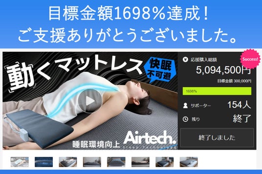 自社ブランドBlueBloodを展開する株式会社ロウダン(本社:愛知県春日井市 代表取締役:志水孝至)は、応援購入サービス「Makuake(マクアケ)」にて実施した「動く寝具 エアテックマットレス」の先行販売プロジェクトにおいて、目標金額1698%を無事達成し、応援購入金額が合計で500万円を突破いたしましたことをご報告いたします。ご支援いただいた皆様に心より感謝申し上げます。