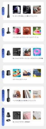 多様なノズル付属で気楽に使える!「CF01」は6種類のノズルを付属しており、ほとんどの製品や汚れに対応できるので、もう「ポンプが合わない」と困ることはありません。
