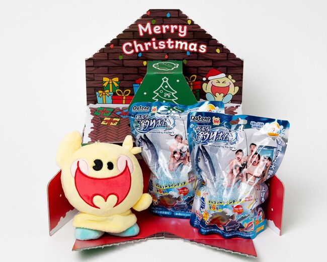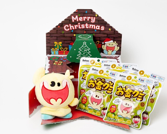 販売数90万袋(※)を突破した「お金グミ」や、販売開始2週間の早さでオンラインストアにて完売となっていた「Dotene びっくら?たまご おふろ釣りボム」に加え、クリスマスボックスでしか手に入らない「どてねくんTシャツ」も登場。各商品と「どてねくん ぬいぐるみキーホルダー」のセットを発売予定です。商品を入れるBOXも、クリスマスツリーが飛び出す特別仕様となっています。各商品数に限りがございますので、お早めにお買い求めくださいませ。