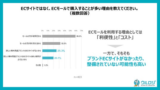 ■一方で、そもそもECサイトにまで手を広げられていないEC事業者が多い可能性も「ECサイトではなく、ECモールで購入することが多い理由を教えてください。(複数回答)」と質問したところ、「モールの方が便利だから」が59.3%、「モールの方が安く買えるから」が32.4%と回答した一方で、