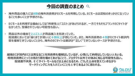 今回の調査で越境ECの商品を購入している外国人の実態について一部を明らかにしました。国内ECとは異なることを海外消費者も理解はしているものの、心情として納得はしていない人もいらっしゃいます。日本でもいえることですが、現地消費者にとっての当たり前を埋めてあげることで、プロダクト以外での強みに転じる可能性も高いでしょう。