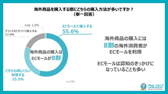 ※本調査結果や資料を引用いただく際は「ウルロジ調べ」と注釈を記載いただくようお願いします。■海外商品を購入する場合、ECモールでの購入が8割「海外商品を購入する際にどちらの購入方法が多いですか?(単一回答)」と質問したところ、「ECモールで購入する」が55.6%、「ECモールとブランドECサイトのどちらも同じくらい利用する 」が25.5%と